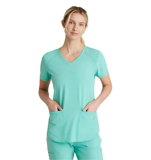 Designed to flatter your figure, this modern fit top features a shaped hem and eco-friendly fabric made with recycled bottles. With 4-way stretch and moisture-wicking properties, this scrub top ensures you stay comfortable and dry throughout your busy day.