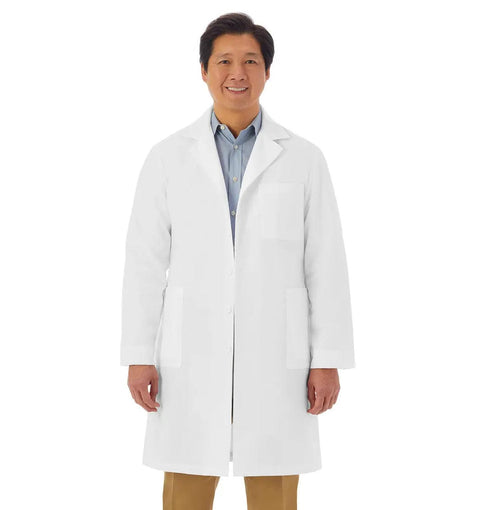 This 40" men's lab coat features a 4 button closure, 5 sturdy pockets, and is composed of a tri-blend fabric designed to resist static, wrinkles, and liquids while remaining machine washable, comfortable, and professional. Boasting a 2 button swing back belt and kick pleating for structure and an enhanced silhouette, this lab coat is an ideal garment for medical professionals in all fields.