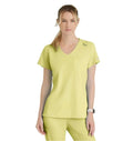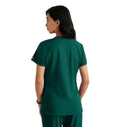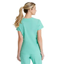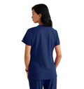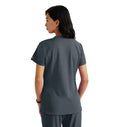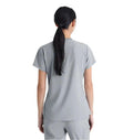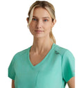 A stylish and practical addition to any healthcare professional's wardrobe. Designed for both comfort and functionality, this top features moisture-wicking, four-way stretch fabric made from recycled plastic bottles, ensuring you stay dry and comfortable throughout your entire shift. The flattering V-neck with a contrast rib and the high-low hem give you a polished look, while the front yoke seam and badge loop provide added convenience. Whether you wear it tucked in or untucked, this versatile scrub top complements your busy lifestyle.