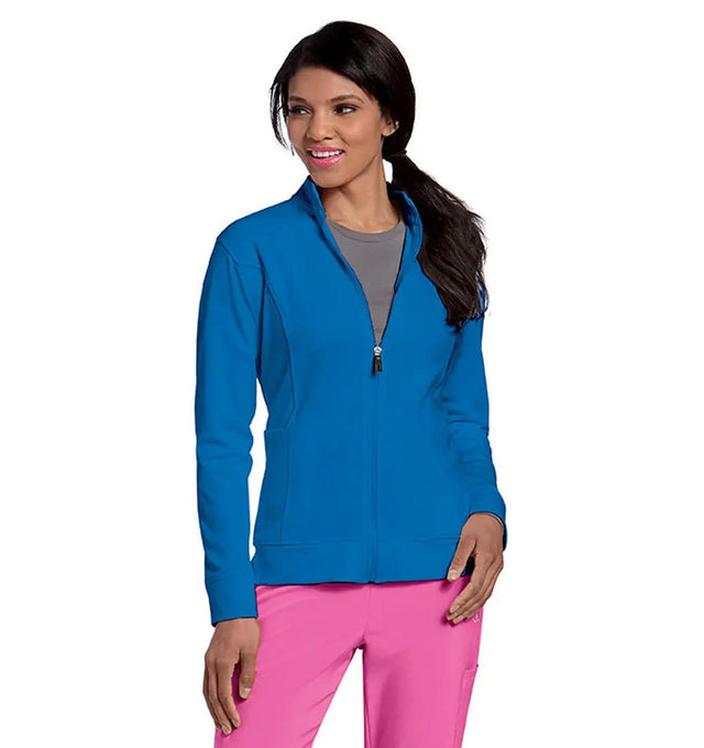 Crafted from 100% moisture-wicking polyester fleece, this warm-up jacket helps regulate temperature while keeping you dry and comfortable throughout the day. The princess seams provide a flattering, body-contouring silhouette, while the 27" length offers full torso coverage. A front zipper closure makes it easy to layer over scrub tops, and the banded cuffs keep sleeves in place during busy tasks. Featuring a built-in earbud cord holder and a dedicated pocket for personal electronics, this jacket is designed for professionals on the go. It embodies Fiumara Medical's mission to provide adaptable, high-performance uniforms that enhance the healthcare experience.
